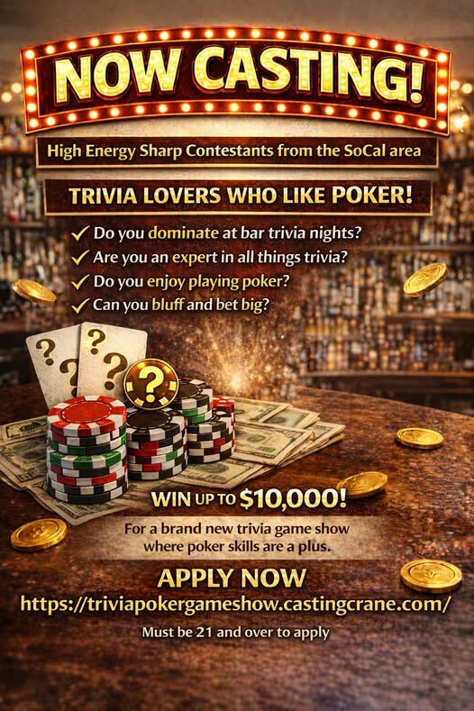 Do you live or plan to travel to the Southern California area soon? Are you great at bluffing and know a thing or two about poker? If so, here is an opportunity to tryout for a new trivia game show where being able to bluff may give you a chance to win big.