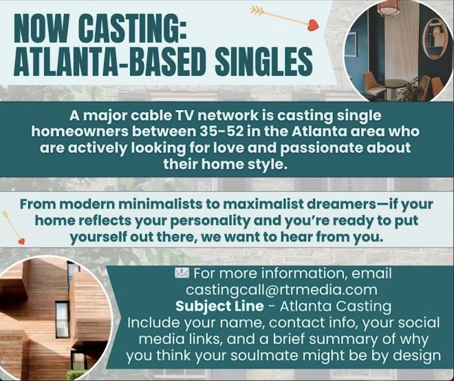 A major cable TV network is casting single homeowners between 35-52 in the Atlanta area who are actively looking for love and passionate about their home style.
