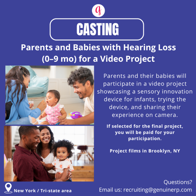 A video project filming in Brooklyn, New York is now casting parents and their babies ages 0 to 9 months who have hearing loss. The project will feature families using a new sensory innovation device designed for infants, with participants trying the device and sharing their experiences on camera.