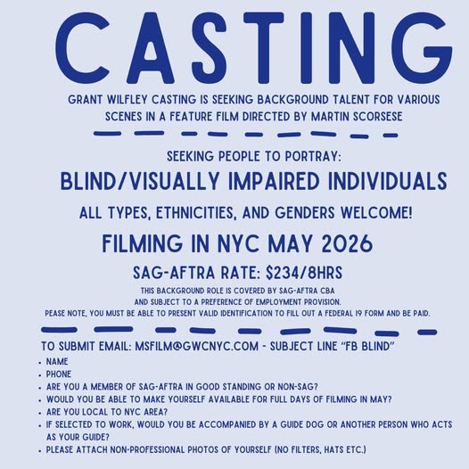 The production will be filming in New York City in May 2026 and is looking for individuals to portray blind or visually impaired characters in various scenes. People of all types, ethnicities, and genders are encouraged to submit.
