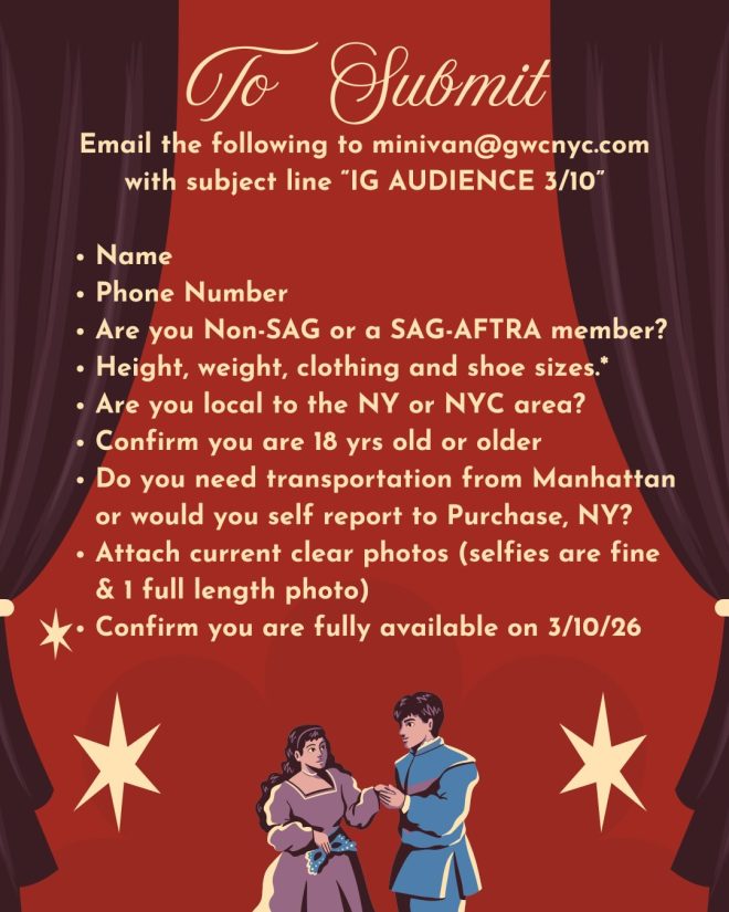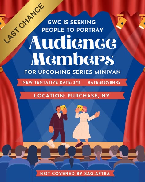 GWC is seeking people to portray audience members for upcoming series MINIVAN – DATE CHANGED to 3/11!TO SUBMIT: Email the following to minivan@gwcnyc.com