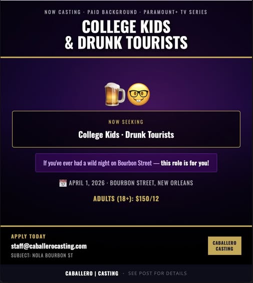 We are seeking background actors age 18-28 to play COLLEGE STUDENTS for a PARAMOUNT+ TV SERIES filming in New Orleans!