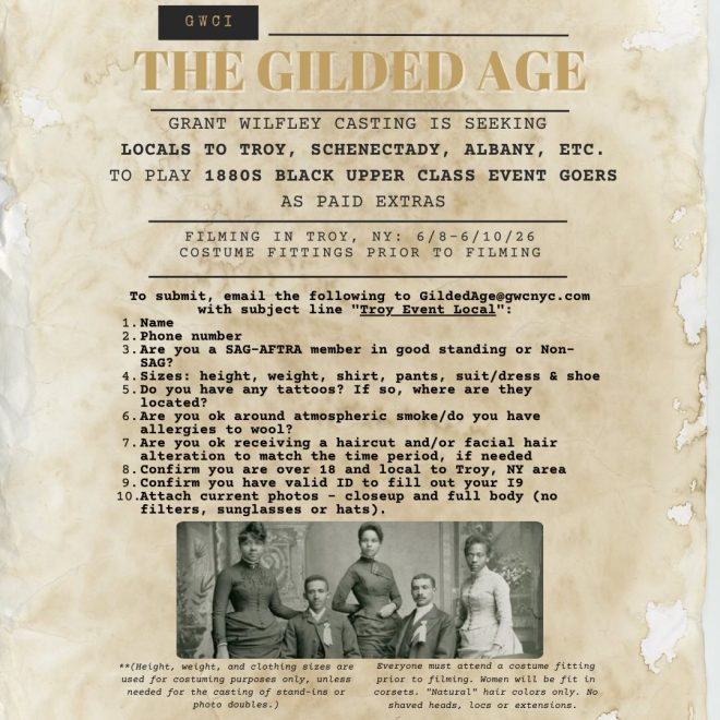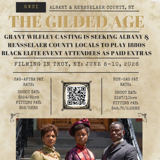 Grant Wilfley Casting, Inc. is looking for locals in Troy, Schenectady, and Albany area to cast as background actors to for a variety of roles including event guests who will fill grand ballrooms, bustling streets and high-society scenes.