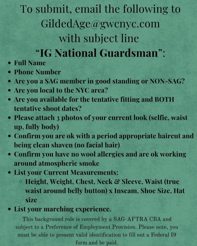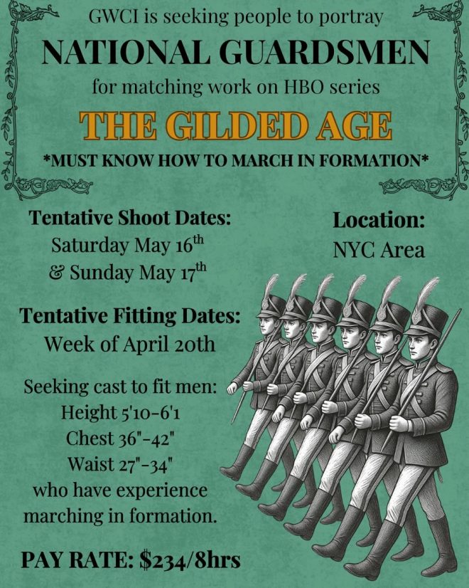 GWCI is seeking people to portray National Guardsman for matching work on HBO’s The Gilded Age.