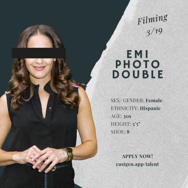 We are seeking photo doubles that closely match each of these actors’ sizes for this upcoming Thursday for the Female role or Friday for the Male role. PAY IS GUARANTEED at $200/12 hours and time and a half for every hour that exceeds the 12th.