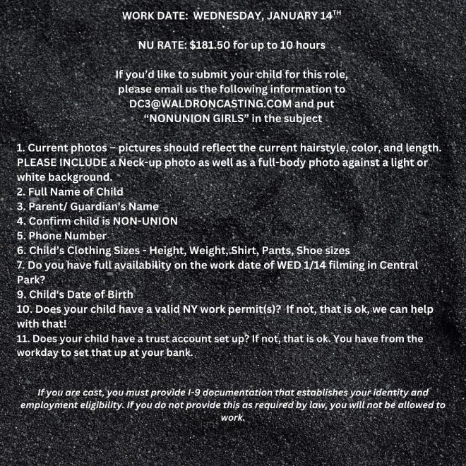 Please note multiple casting notices are listed below. You must live in the NYC area to be considered. Casting directors on this in Waldron Casting in NYC.