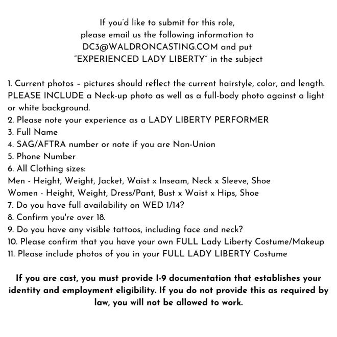 Waldron Casting is seeking experienced LADY LIBERTY performers with FULL costume & make-up for paid background work on the TV series Dead City.