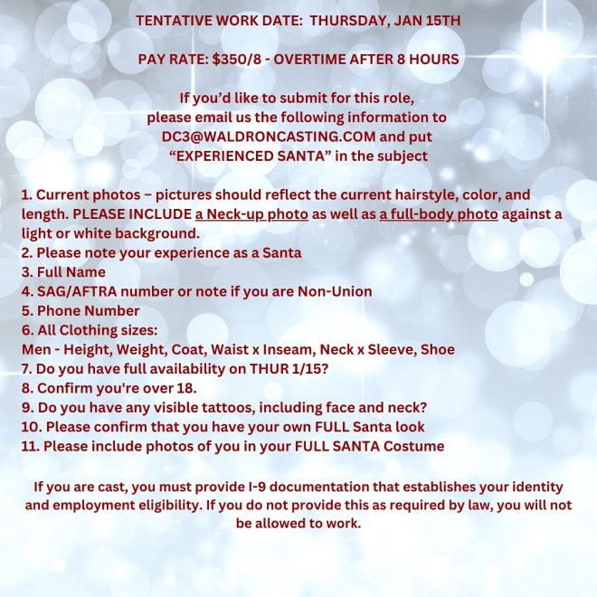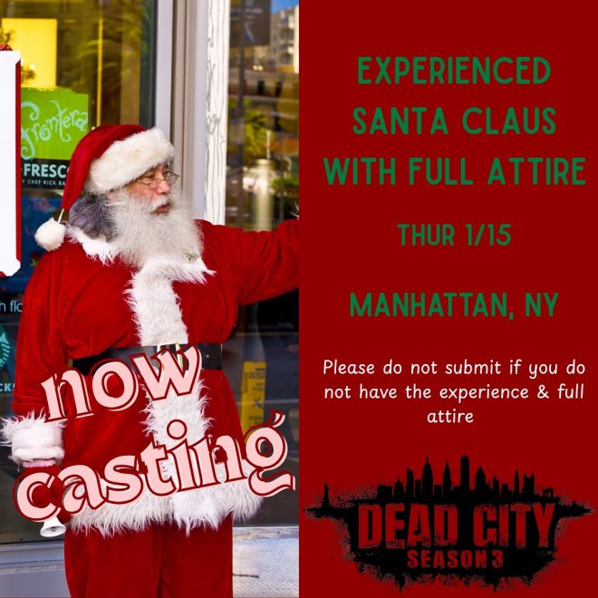 Waldron Casting is seeking experienced SANTAS with a FULL Santa costume for paid background work on the TV series Dead City
