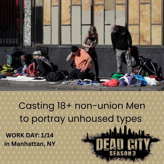 Waldron Casting is seeking NON-UNION men to portray unhoused types for paid background work on the TV series Dead City