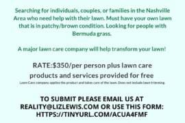 People who need lawn help Location: Nashville, TN Type: TV Commercial Role People who need lawn help! Principal – Non… Read More »Casting Call for People in Nashville Who Need Help With Their Lawn