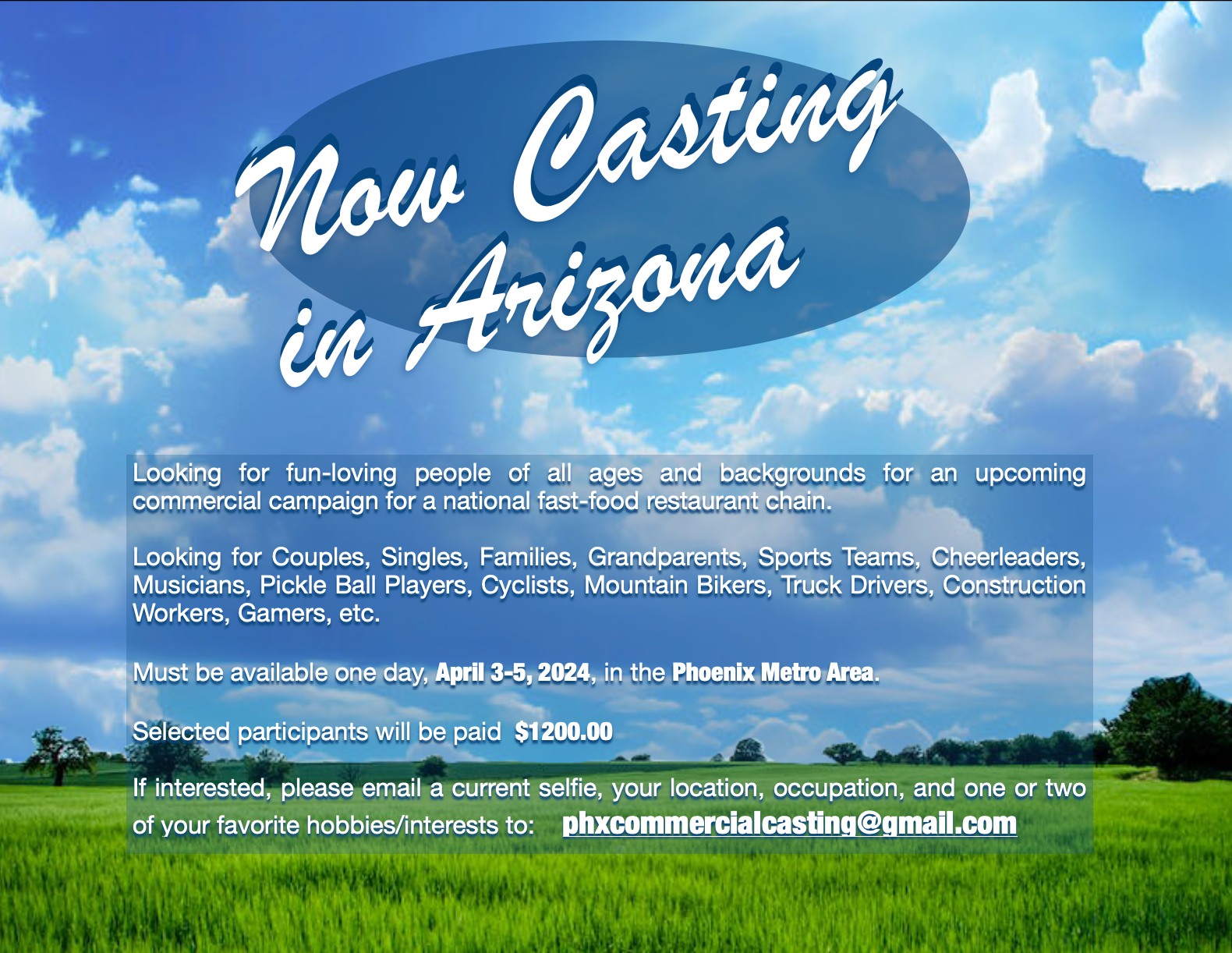 Nationwide –  Real Anglers for Apparel Commercial A nationwide casting call is underway for an upcoming apparel commercial seeking real anglers to participate in a shoot taking place in Arizona from April 9 to April 11. The production is looking for both men and women who are authentic outdoor enthusiasts with strong fishing skills. Compensation… Read More »