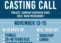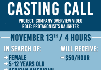 Equis Financial Company Overview Video Location: Asheville, NC Type: Video Role: Protagonist’s Daughter Date: November 13 In search of: Female, 5-12 years old, African American Will Receive: $50/hour (4 hours total) Please send headshot, resume, or acting reels to: dstapp@equisfinancial.com Payment: Paid City or Location of call: Asheville, NC Please submit to: dstapp@equisfinancial.com by 2019-11-04… Read More »