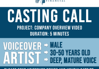 Equis Financial Company Overview Video Location: Asheville, NC Type: Video CASTING CALL: Voiceover Artist Local (Asheville, NC) Male, 30-50 Years Old Deep, Mature Voice Script Duration: 5 Minutes Compensation: Negotiable Please send voiceover demos and hourly rates to: dstapp@equisfinancial.com Payment: Paid City or Location of call: Asheville, NC Please submit to: dstapp@equisfinancial.com by 2019-11-29 This… Read More »