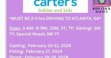 Baby modeling auditions. CASTING Holiday 2024 – Carter’s babies and kids – Auditions for kids, baby and Toddlers on Carter’s Exclusive Brands this holiday season. Auditions for Babies and Toddlers for a Carter’s promotional campaign for the holidays 2024. Requirements: Must reside within a 2-3 hour driving distance from Atlanta, GA Casting sizes: Kids sizes:… Read More »