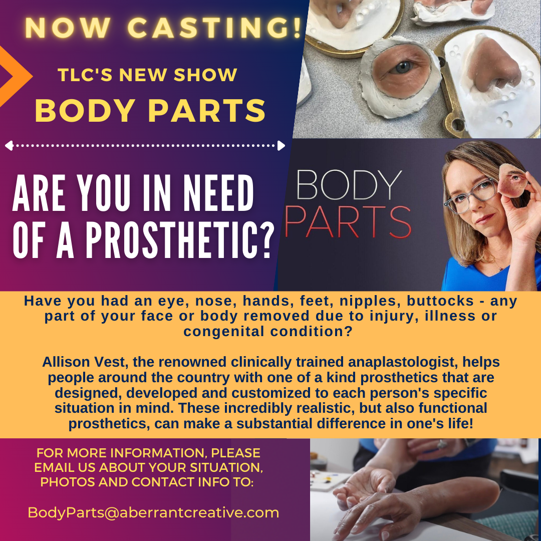 TLC’s Body Parts Now Casting Location: Nationwide USA Type: Reality TV NOW CASTING! APPLY TODAY! TLC’S new show BODY PARTS featuring Allison vest. A renowned clinically trained anaplastologist that helps people around the country with one of a kind of prosthetics that are designed, developed and customized to each person’s specific situation in mind. These… Read More »