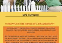 CastingHaus – Home Justice Location: Nationwide Audition / Call Type: NOW CASTING NATIONWIDE DO YOU HAVE A HOME-RELATED DISPUTE THAT NEEDS TO BE SETTLED WITH YOUR ROOMMATE, FRIEND, SIBLING, NEIGHBOR, CONTRACTOR, DESIGNER, OR ANYONE ELSE? IF YOU HAVE A HOME-RELATED DISPUTE THAT NEEDS TO BE SETTLED CONTACT US ASAP! GET PAID to tell your story and… Read More »