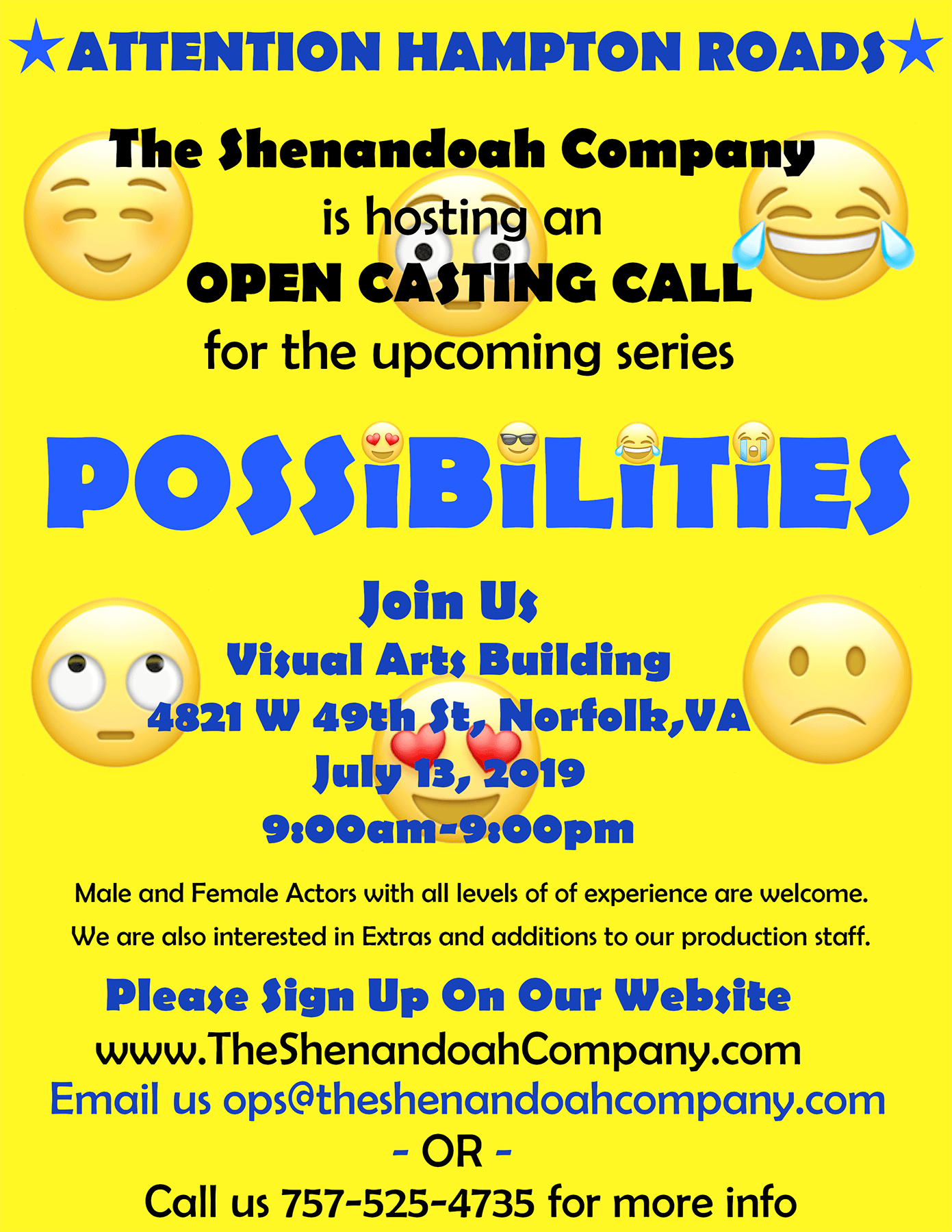 Possibilities Location: Virginia Beach/ Norfolk/ Chesapeake, VA Type: Film CASTING CALL The Shenandoah Company Presents “POSSIBILITIES” Casting Date: July 13, 2019 Casting Times: 9AM – 9PM Casting Location: Visual Arts Bldg , 4821 W 49th St, Norfolk, VA Who We Are Looking For: Male and female actors age 18-35 all ethnicities and with any level… Read More »