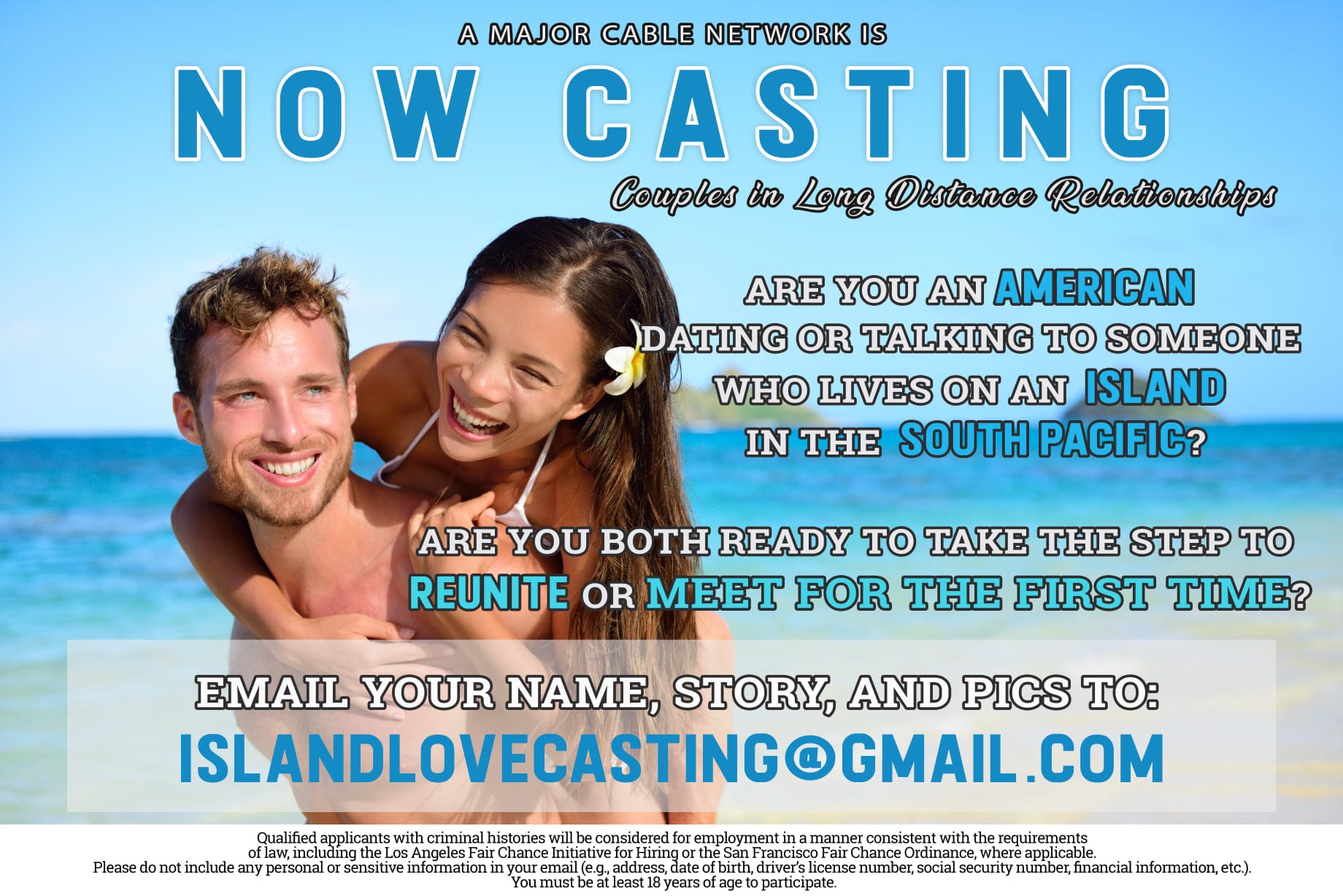 NOW Casting Long Distance Couples! A Major Cable Network brings you a brand new docu-series! Do you live in the US, but are either talking to, or dating someone who lives in Paradise, in one of the South Pacific Islands (Fiji, Bora Bora, Tahiti, french Polynesia, etc)? We are currently looking for people in long… Read More »