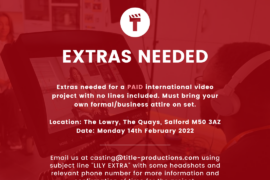 Extras Needed URGENTLY (NO LINES) – International Video Project Location: Greater Manchester UK Type: Film URGENT PAID JOB – EXTRAS NEEDED – NO SPEAKING ROLE We are filming a fictional, corporate event for a company named ‘Lily Markets’. The final short video will be a promotional press conference where the actors will be promoting the… Read More »