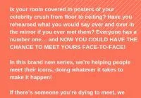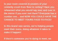 Meet Your Celerity Icon. Location: Los Angeles, CA Type: Docu-series WHAT IF YOU WERE GIVEN THE CHANCE TO MEET YOUR ICON? Is your room covered in posters of your celebrity crush from floor to ceiling? Have you rehearsed what you would say over and over in the mirror if you ever met them? Every has… Read More »