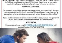 Got Rivals? Now Casting for a Rivals reality competition Television show. Do you love to compete? Do you have a rival that you would love to take on in a competition? If so, read on. The producers and casting directors for the Rivals TV show are now looking for people with huge personalities that are… Read More »