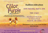 The Color Purple Musical Auditions Location: Washington, DC Type: Theater CAK Productions announces audition for the hit musical The Color Purple! The auditions will be on April 11, 2015 from 3:00pm to 5:00pm. Be prepared to sing 16 bars of your choosing and a cold read. Auditions will be held at the First Baptist Church… Read More »
