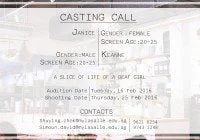 Pen My Life Location: Singapore, ITE College East Type: Film Cast: Paige (Main Character, Age 18, Female), Samantha (Paige’s Friend,Age 18, Female), Ignatius(Paige’s Ex-Boyfriend, Age 19, ), Lucas(Paige’s Boyfriend,Age 19,) Eric( Paige’s Father,Age 37), Melissa(Paige’s Mother, Age 35) No Audition is required (MUST have basic acting knowledge) Filming dates: 21,22,23,24 and 25 March HP:+65 8201… Read More »