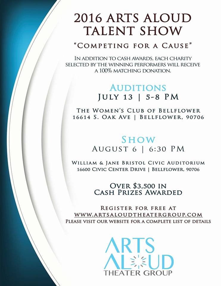Arts Aloud is auditioning young performers between the ages of 13­-18 to appear in a talent showcase at the City of Bellflower’s William & Jane Bristol Civic Auditorium. Each act will compete for a cash prize and a 100% matching donation for their chosen charity. The event draws a strong media presence that includes entertainment luminaries who participate as talent judges and presenters.