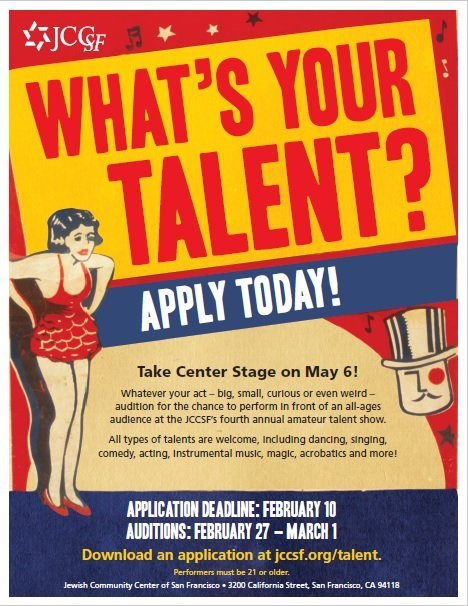 JCCSF’s Fifth Annual Talent Show (Talent Needed) Location: San Francisco, CA Type: General Performers Join us for our fifth annual amateur talent show: What’s Your Talent? Here’s your opportunity to take center stage, whatever your act — big, small, curious or even weird. Individuals and groups ages twenty-one and older are encouraged to participate. Perform… Read More »
