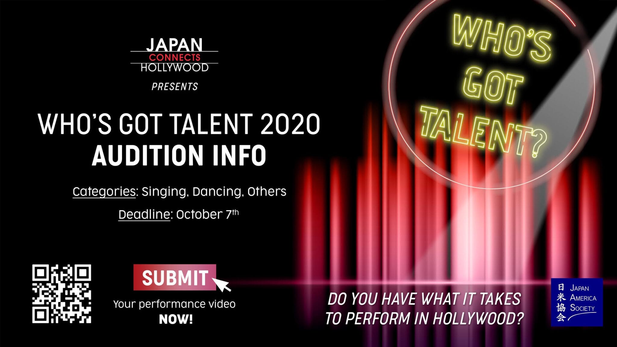 JCH Presents Who’s Got Talent? Online Talent Show – submit your performance for a chance to perform in Hollywood Location: nationwide Type: Music Contest Please go to our submission for if interested: https://docs.google.com/forms/d/e/1FAIpQLSddaID3Yg-pXvjw_ffu74Q2kxmalNpcic0MrFPGNH9aBp8VAw/viewform?fbclid=IwAR2T9RWPPjiXbGaMFtwgX2Ll_xEqVPe-vEg_TlCB6B3pgobapf3F9I6_6ho Submit your videos to win a chance for an exclusive interview featuring you/your team on Japan Connects Hollywood Website and Social Media,… Read More »