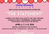 Casting paid background actors near the St. Pete, FL. area. Please note that this movie is filming in the St. Petersburg, Florida area and you must be a local in order to be considered. NOW CASTING PAID BACKGROUND ACTORS FOR: “THE STATEMENT” STARRING: PAUL RUDD, PAUL GIAMATTI, AND JOHN TURTURRO FILMING IN THE ST. PETERSBURG,… Read More »