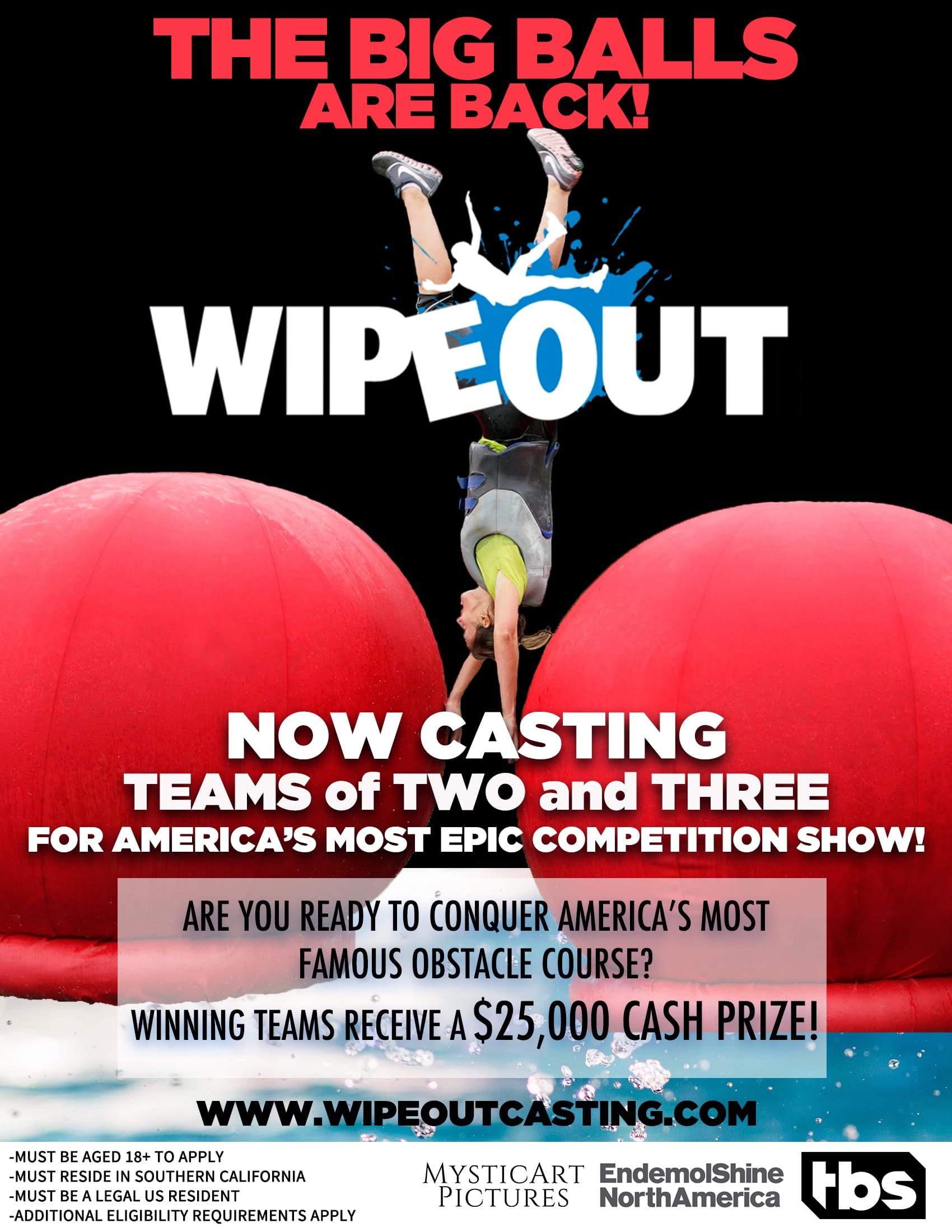 Wipeout Auditions The hit ABC series Wipeout is now casting for season 5! There are 2 open casting calls scheduled this month. Both open calls will be in the Southern California area, Anaheim and San Diego. Do you think you can tackle some extreme obstacle courses? How about some of the world’s largest obstacle courses?… Read More »